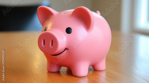 Cute Pink Piggy Bank on a Wooden Table with Soft Lighting