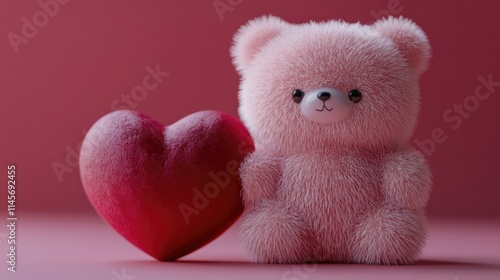 Cute pink teddy bear doll beside a vibrant red heart on a soft pink background symbolizing love and affection.