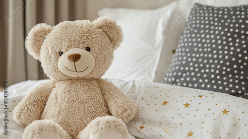 Cute Plush Teddy Bear on White Bed with Gold Stars Bedding