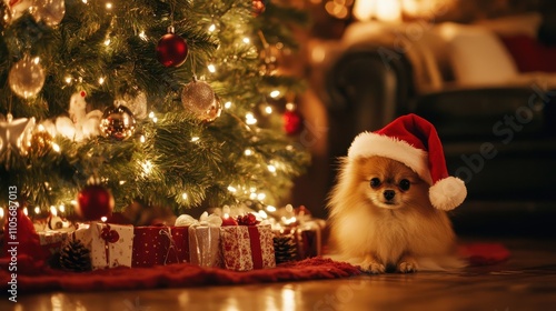 Cute Pomeranian Dog in Santa Hat by Christmas Tree