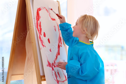 Cute preschooler girl drawing or painting indoors