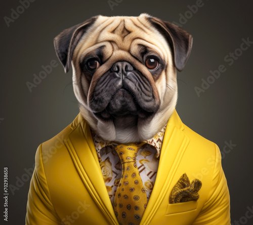 Cute pug in a yellow jacket and a tie around his neck, on a dark background. Office worker concept.