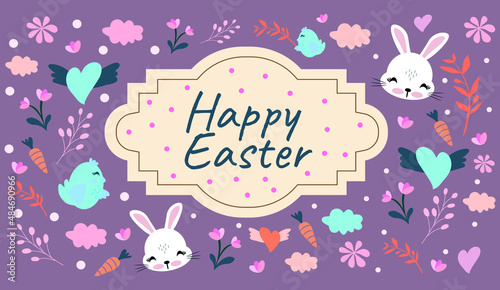 cute rabbit and easter set of flowers and eggs. happy easter greeting card