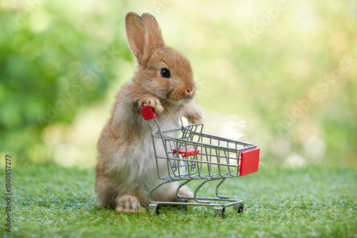 cute rabbit pushing empty shopping trolley cart and looking some food on a green grass