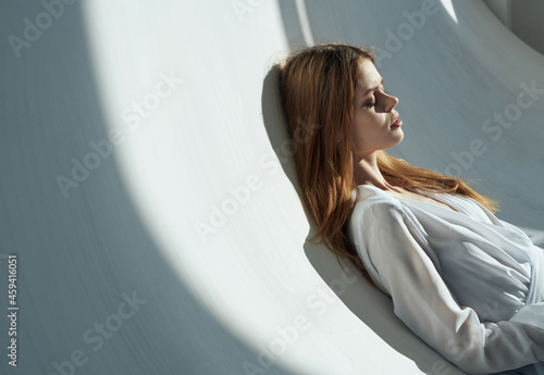 cute red-haired woman in a white robe lies on a white background