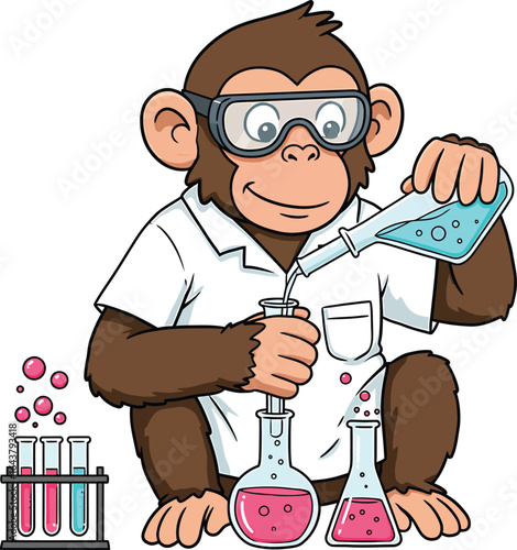 clip art, monkey, vector, scientist, chimpanzee, laboratory, science, experiment, research, animal, cute, cartoon, chemistry, beaker, flask, test tube, laboratory, smart, cognition, education, studying, learning, goggles, coat, biology, discovery, innovation, fun, teaching, isolated, illustration, design, mascot, intelligent, academic, goggles, face