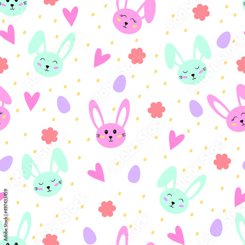 Cute seamless pattern with rabbits. Vector illustration for Easter with Bunny, egg, heart, flower. Characters for kids, fabrics, greeting cards, wallpapers, gift wrapping paper, web page etc.