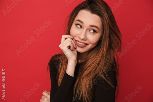 adult, attractive, background, beautiful, beauty, brunette, casual attire, caucasian, charming, cheerful, confident, copy space, emotion, emotional, expression, female, friendly, fun, girl, hair, happy, isolated, joy, joyful, lady, laughing, lifestyle, modern, person, portrait, positive, pretty, red, standing, stylish, trendy, woman, young, youth, cute