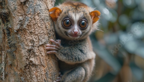 Cute slow loris clinging to a tree in the forest