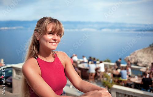 Cute smiling young woman during vacation sitting on terrace with sea view