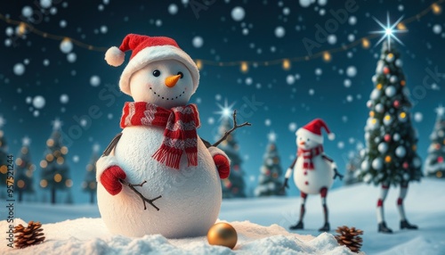 Cute snowman, wearing a red Santa hat and a striped scarf. The snowman has a cheerful face with sparkling eyes and a carrot-shaped nose. In the background, there is a Christmas tree decorated. robots