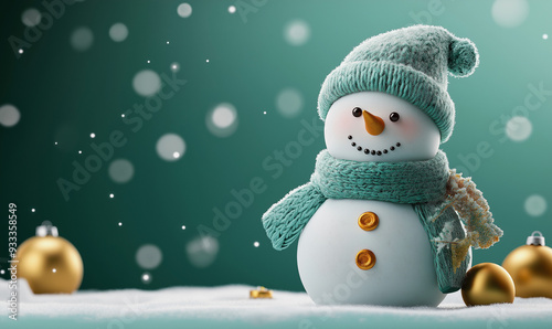Cute snowman with teal hat and scarf on snowy background with gold ornament, winter holiday scene