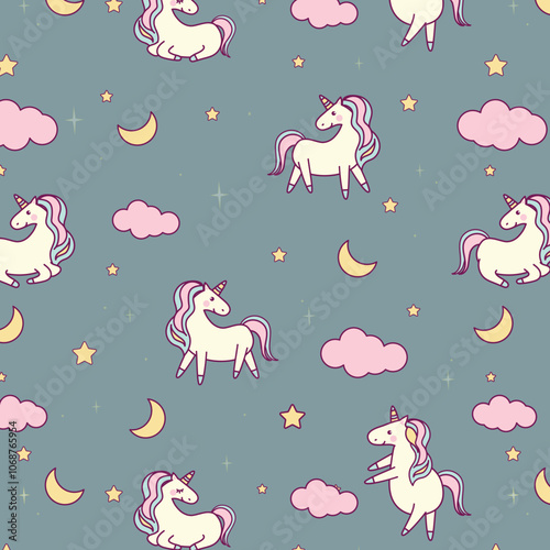 pattern, unicorn, vector, art, background, design, baby, illustration, cartoon, white, cloud, animal, star, happy, seamless, horse, wallpaper, character, rainbow, cute, doodle, fabric, pink, colourful, fantasy, magic, print, dream, textile, decoration, sweet, fairy tale, pony, repeat