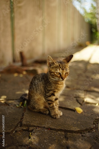 kitten, cat, sitting, tabby, cute, standing, sunny, summer, yard, moustache, look, portrait, nature, street, sidewalk, stone, road, animal, pet, yong, sit, grey, grey, fence, paw, ear