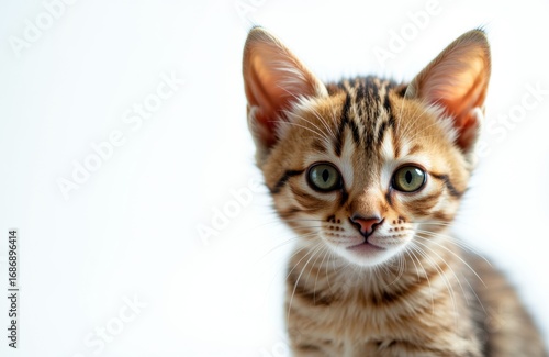 kitten, cat, felino, animal, pet, domestic, cute, young, adorable, green, eye, striped, fur, playful, curious, mammal, small, furry, care, wildlife, nature, portrait, close, up, innocence, soft, whisker, face, photo, natural, background, white, copy space