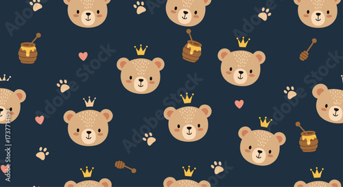 Cute teddy bear pattern with crowns and honey jars on a dark blue background.