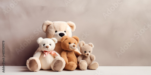 Cute teddy bears sitting together on brown background, copy space. Generative AI.