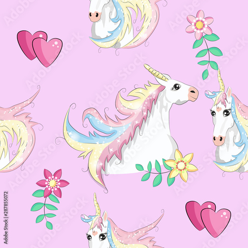 Cute unicorns seamless pattern. Kids pattern with unicorns, flowers, balloons, clouds and rainbow
