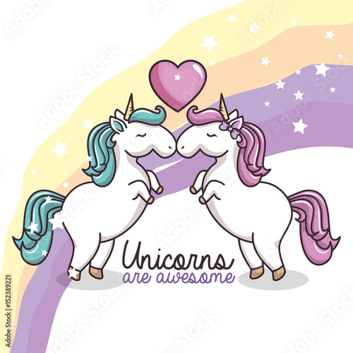 Cute unicorns with heart over white background with rainbow. Vector illustration.