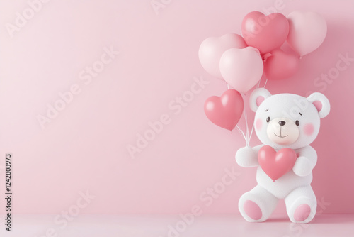 Cute white teddy bear holding heart-shaped balloons on a pink background, symbolizing love, affection, and Valentine's Day celebrations.