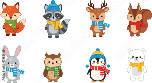 Cute winter animals wearing scarves and hats, cartoon forest wildlife vector illustration for children, Christmas holiday design, seasonal clipart collection