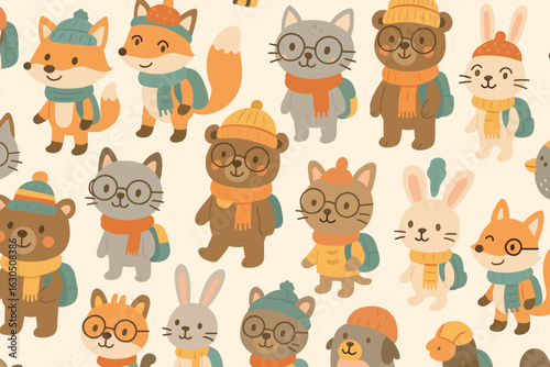 timberland, animal, autumn, cartoon, cute, fox, bear, cat, rabbit, dog, adventure, colourful, playful, cosy, character, forest, friends, warm, clothing, foulard, hat, backpack, joyful, expression, whimsical, nature, illustrated, seasonal, childhood, fun, exploration, creature, happiness, adorable, theme, cheerful, atmosphere, pattern, charme, animal, design, innocence, creativity, illustration, warmth