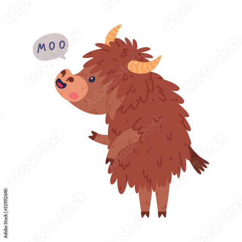 Cute Yak Character with Dense Fur and Horns Saying Moo Vector Illustration