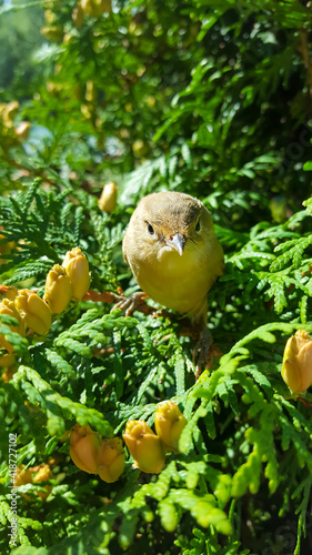 Cute yellow baby bird on a green tree with yellow buds. Beautiful natural vertical background