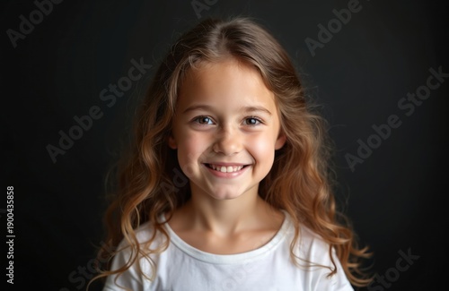 Cute young girl with long wavy hair smiles happily. Small child with bright eyes and joyful expression against plain dark background. Pure innocent childhood joy displayed.