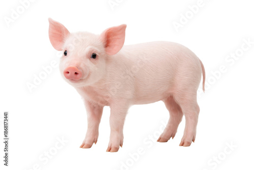Cute young piglet standing in a natural pose, full body view, isolated on a clean white background. Adorable farm animal with soft pink skin, small hooves, and a gentle expression