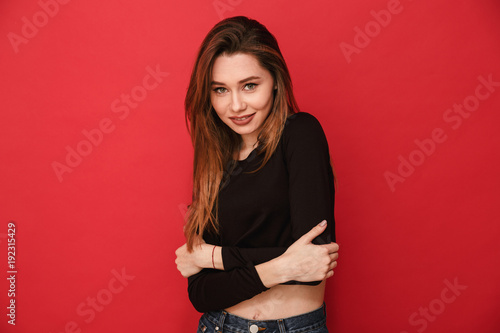 adult, attractive, background, beautiful, beauty, brunette, camera, casual attire, caucasian, charming, cheerful, confident, copy space, emotion, emotional, expression, female, friendly, fun, girl, hair, happy, isolated, joy, joyful, lady, lifestyle, looking, modern, person, portrait, positive, pretty, red, standing, stylish, trendy, woman, young, youth, smile