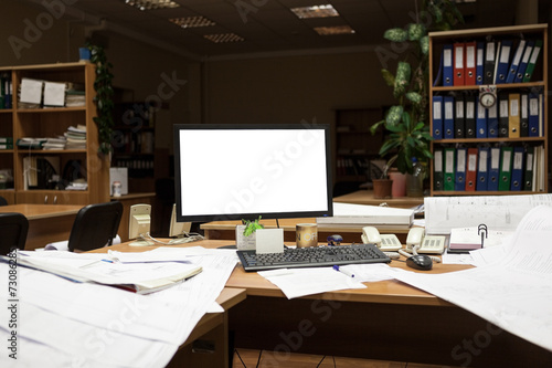 interior, table, nobody, corporation, corporate, business, concept, contemporary, occupation, light, equipment, modern, place, room, desk, design, architecture, company, organisation, work, indoor, job, office, monitor, engineer, engineering, dark, empty, night, screen, white, blank, cup, black, display, success, cyberspace, finance, computer, keyboard, drawing, plan, document, paper, isolated, cut-out, projection, drafting, planning