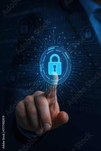 cyber security surveillance policy concept. Digital security concept with a hand touching a lock symbol.