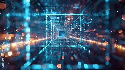 Cyber technology background with an infinite light blue square tunnel of glowing dots.