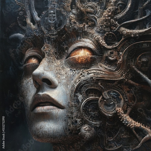 cyborg, woman, face, machine, metal, stone, gear, technology, futuristic, fantasy, artwork, digital, art, portrait, eye, texture, dark, grey, brown, orange, complex, intricate, detailed, robotic, android, science, fiction, mechanical, organic, abstract, surreal, expression, enigmatic, mysterious, powerful, dreamlike, gothic, bronze, ancient