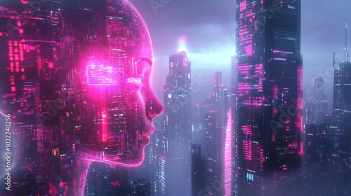 futuristic, city, digital, head, woman, human, artificial, intelligence, ai, technology, neon, light, night, skyscraper, building, urban, glow, future, science, fiction, science fiction, graphic, art, illustration, virtual, reality, datum, network, interface, circuitry, grid, abstract, fantasy, modern, pink, blue, purple, dark, fog, mist, three-dimensional, concept, design, style
