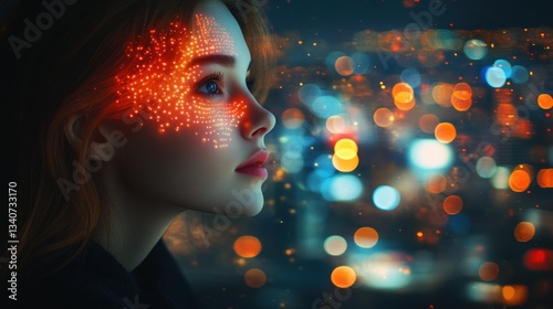 woman, face, light, future, technology, digital, glowing, portrait, red, orange, night, city, bokeh, dark, fantasy, art, girl, beautiful, dream, science, fiction, modern, abstract, style, graphic, design, aesthetic, visionary, intriguing, mysterious, mesmerizing, captivating, alluring, illuminated, futuristic, evocative, beauty, fashion, model, hair, make-up, make-up, eye, lip, closeup, glamour, skin
