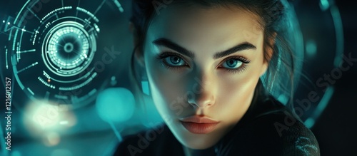 woman, portrait, futuristic, technology, teal, blue, eye, face, girl, model, digital, art, science, fiction, fantasy, modern, aesthetic, cyber, future, innovation, glowing, light, dark, beauty, intriguing, mysterious, enigmatic, intricate, graphic, visual, style, design, composition, screen, interface, circle, line, gaze, expression, confident