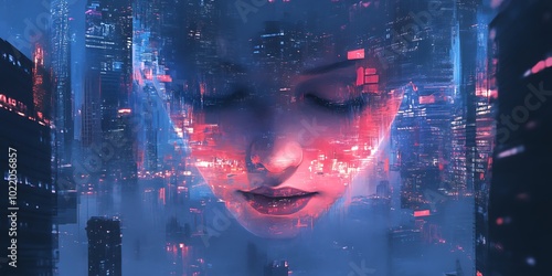 woman, portrait, face, neon, city, futuristic, technology, city landscape, digital artwork, science fiction, abstract, fantasy, surreal, glowing, light, dark, night, mood, atmosphere, art, illustration, concept, graphic design, wallpaper, background, design, style, retro, modern, contemporary, colourful, vibrant, graphic, creative, artwork, artificial intelligence