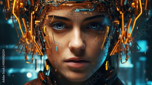 woman, digital, technology, future, artificial, intelligence, human, enhancement, machine, cyborg, android, futuristic, science, fiction, robotic, art, reality, avatar, virtual, cyber, space, electronic, circuitry, implant, interface, technically, innovation, evolution, progression, glowing, head, eye, face, portrait, closeup, painting, concept, design