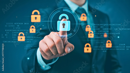 Cybersecurity Man Interacting with Digital Locks Representing Data Protection