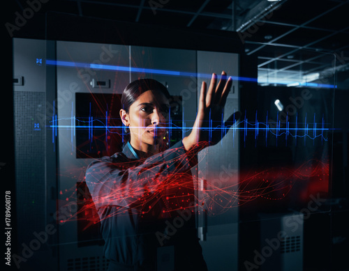 security, abstract, concept, metaphor, protection, safety, defense, shield, guardian, resilience, strength, determination, sharpened, concentration, technology, future, innovation, ai, artificial, intelligence, datum, analysis, big, server, network, dark, moody, cinematic, light, shadow, play, contrast, high, tech, futuristic, aesthetic, woman, power, leadership, expertise, skill, mastery, vigilant