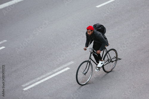 winter, wheel, vintage, vehicle, urban, travel, transportation, technology, street, sport, road, red, people, pavement, overhead, outdoors, motion, man, leisure, hat, fall, denim, bicyclist, city, black, bike, bicycle, autumn, african, 30, full body, one person, male, person, adult, adult, 20s, grown-up