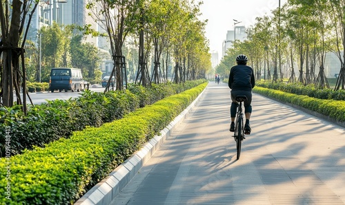 cycling, bike, rider, path, road, tree, green, urban, morning, sunlight, shadow, helmet, bicycle, lane, city, landscape, outdoors, transportation, exercise, recreation, healthy, lifestyle, nature, scenery, park, pavement, plant, bush, asphalt, smooth