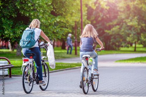 Cyclists ride on the bike path in the city Park