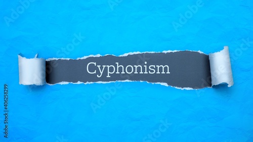 Cyphonism. Blue torn paper banner with text label. Word in gray hole.