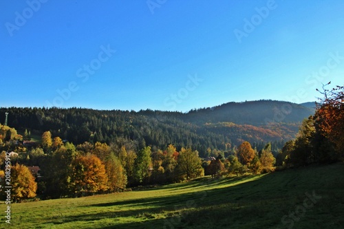 landscape, autumn, sky, forest, nature, fall, tree, tree, mountain, grass, green, field, cloud, blue, mountain, meadow, countryside, rural, yellow, summer, outdoors, cloud, season, country, sunset