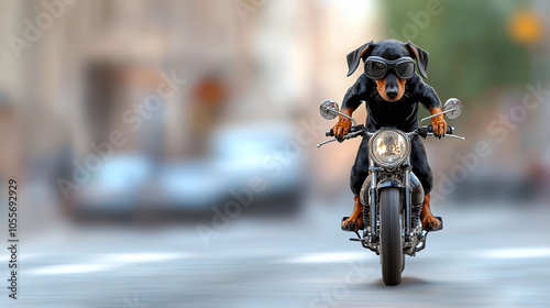 Dachshund riding motorcycle with goggles in urban scene, showcasing playful and adventurous spirit. dog exudes confidence and excitement while navigating city streets