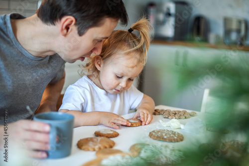 Dad and daughter decorate Christmas gingerbread at home. A boy and a girl paint with cornets with sugar icing on cookies. New Year's decor, branches of a Christmas tree.
