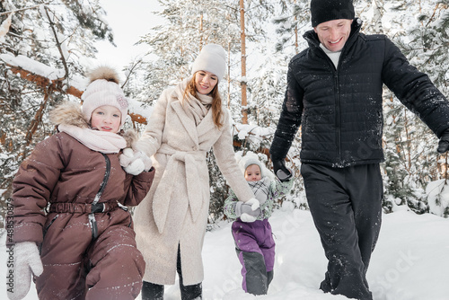 dad and mom and daughters have fun in the snowy forest. High quality photo